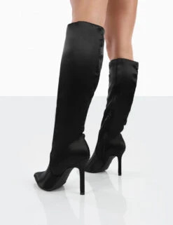Best Believe Black Satin Pointed Toe Stiletto Heeled Knee High Boots