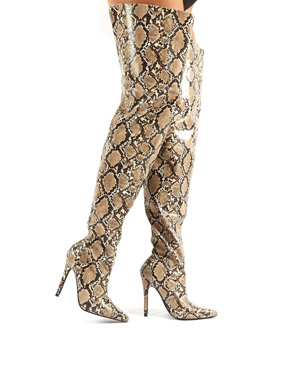 Rita features a gorgeous PU snake print material, pointed toe, stiletto high heel and wide fit over the knee upper.