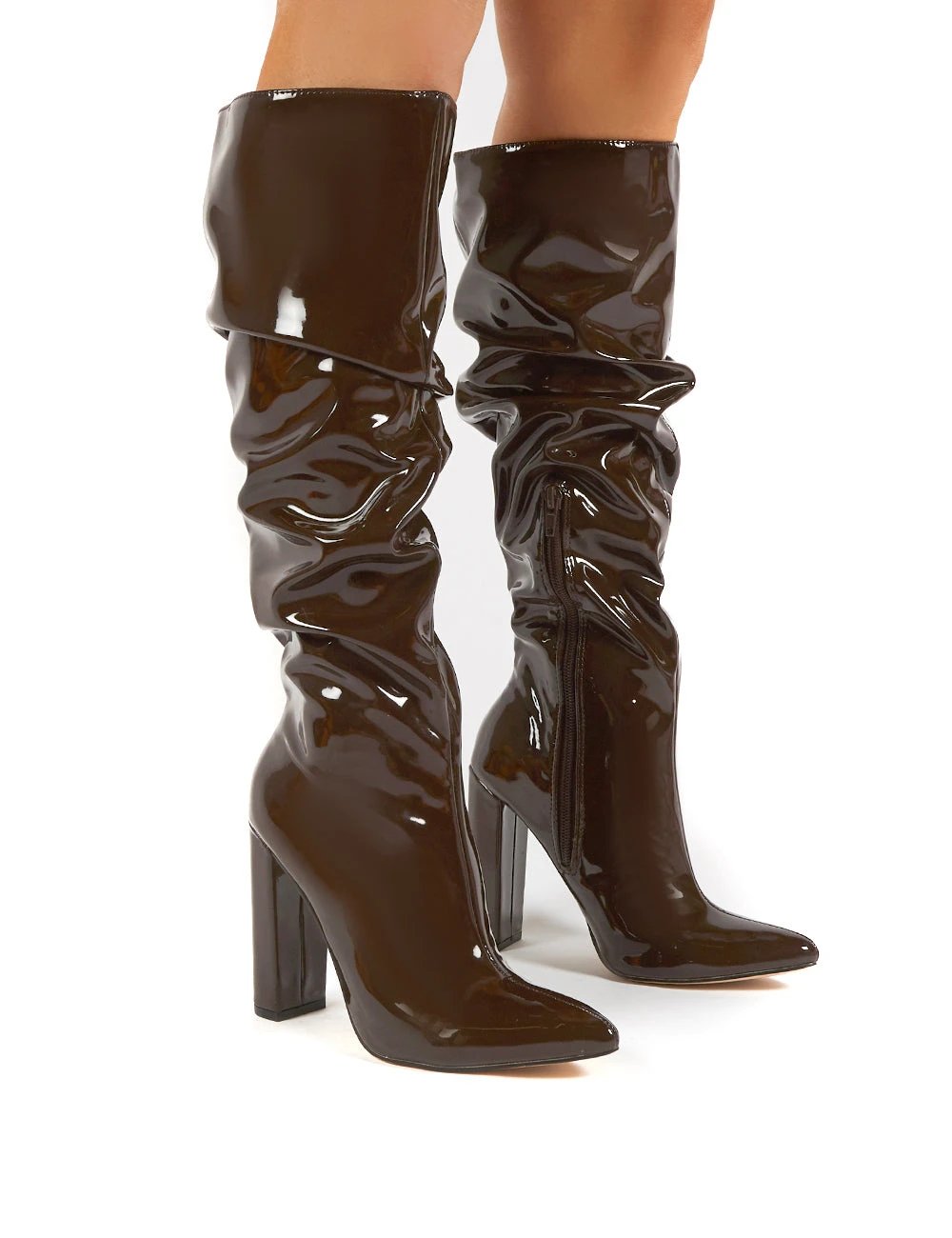 Get ready for knee high boot season in these ultimate boots! Yours features a patent finish with a ruching design and block heel. We cannot get enough of these!